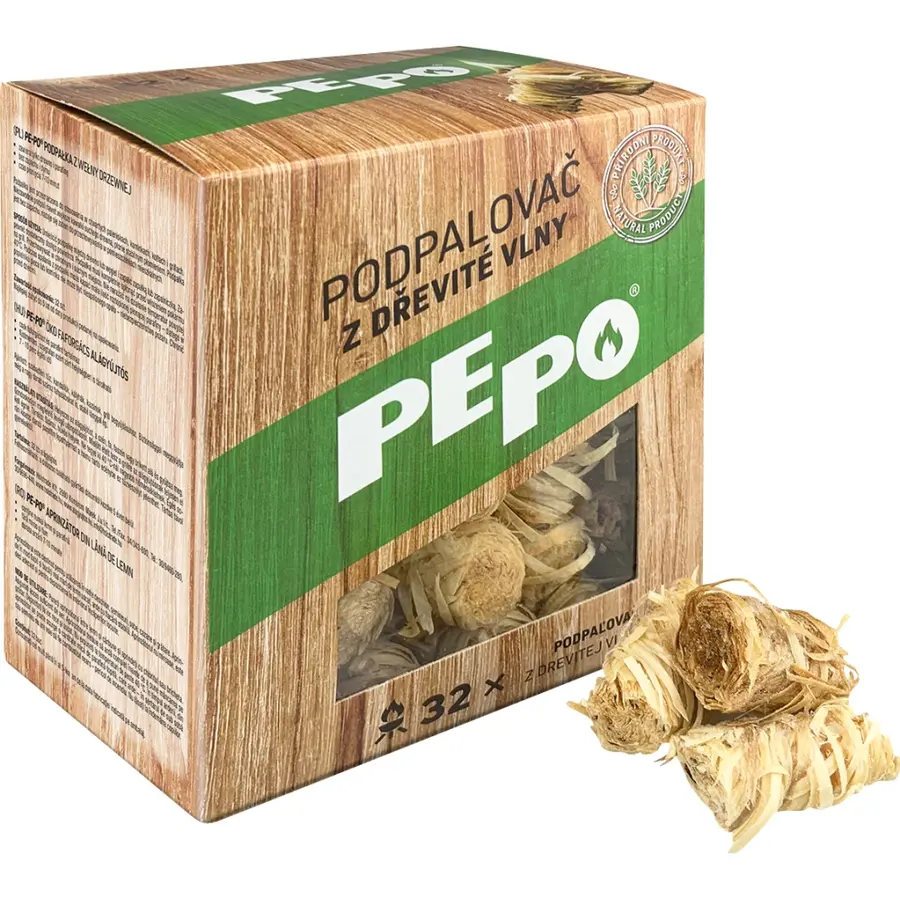 PE-PO podpalovač z dřevité vlny. Obsahuje pouze smotky dřevité vlny napuštěné parafínem. Tento podpalovač pepo je vhodný ke skladování v interiéru obytných místností.