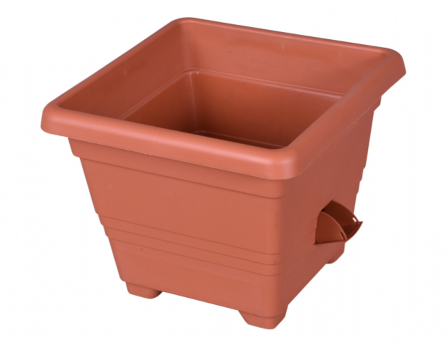 Květník čtvercového půdorysu s hladkým povrchem a nožičkami umožňujícími odtok vody. Kromě knotu obsahuje okénko na zalévání, k odtoku přebytečné vody při dešti a přístupu vzduchu ke kořenům. Rozměry: 30 x 30 cm, výška: 24 cm.