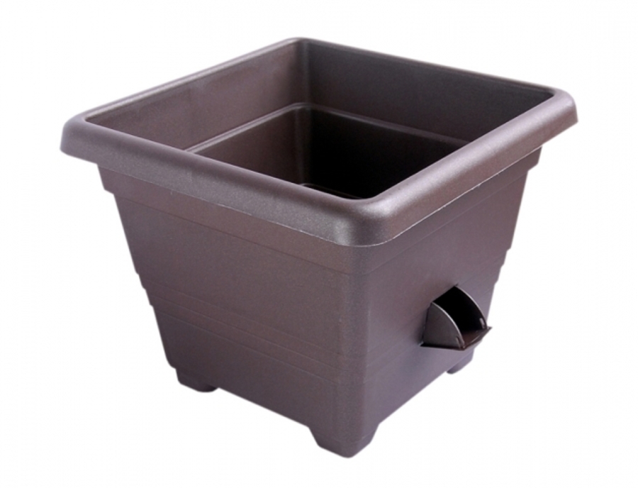 Květník čtvercového půdorysu s hladkým povrchem a nožičkami umožňujícími odtok vody. Kromě knotu obsahuje okénko na zalévání, k odtoku přebytečné vody při dešti a přístupu vzduchu ke kořenům. Rozměry: 35 x 35 cm, výška: 28 cm.