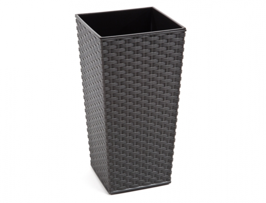 Vysoký obal s rattanovým designem. Je odolný vůči UV záření a poškrábání. Je vyroben z lehkého plastu, snadno se čistí. Má černou vnitřní vložku s úchyty.
