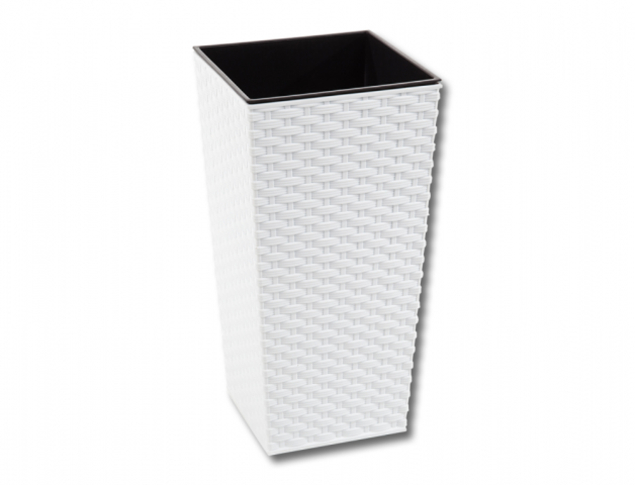Vysoký obal s rattanovým designem. Je odolný vůči UV záření a poškrábání. Je vyroben z lehkého plastu, snadno se čistí. Má černou vnitřní vložku s úchyty.