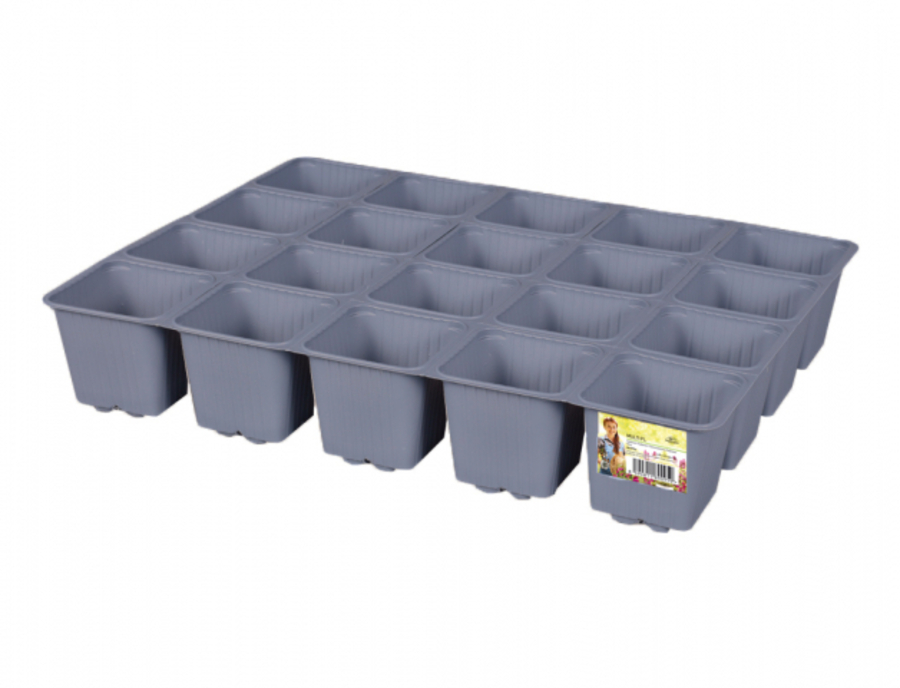 Lehčený plastový sadbovač se čtvercovými buňkami. Vyroben z vysoce kvalitního recyklovatelného plastu. Materiál je pevný a odolný, přitom velmi lehký. Buňky zajišťují optimální cirkulaci vody a vzduchu pro zdravý růst rostlin, usnadňují manipulaci a stohování při transportu i skladování. Povrch je hladký, bez vnitřních hran, což podporuje rychlý kořenový vývoj a snadné čištění. Doporučeno k použití ve skleníku nebo na chráněném venkovním stanovišti. Plně recyklovatelný jako plast. Počet buněk: 20. Půdorys buňky: čtverec. Rozměr buňky: 6,4 × 6,2 cm. Objem buňky: 195 ml. Rozměry: délka 36,0 cm, šířka 28,0 cm, výška 6,5 cm. Barva: šedá.