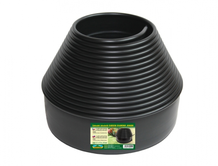 Zahradní obrubník je vhodný pro oddělení trávníku od okrasných záhonů, zpevněných cest, pro ohraničení solitérů v zahradě nebo parku. Spolehlivě zabraňuje prorůstání trávníku. Je odolný proti poškození běžnými zahradními sekačkami a strunovkami. Barva: černá. Výška: 10 cm, délka: 12 m.