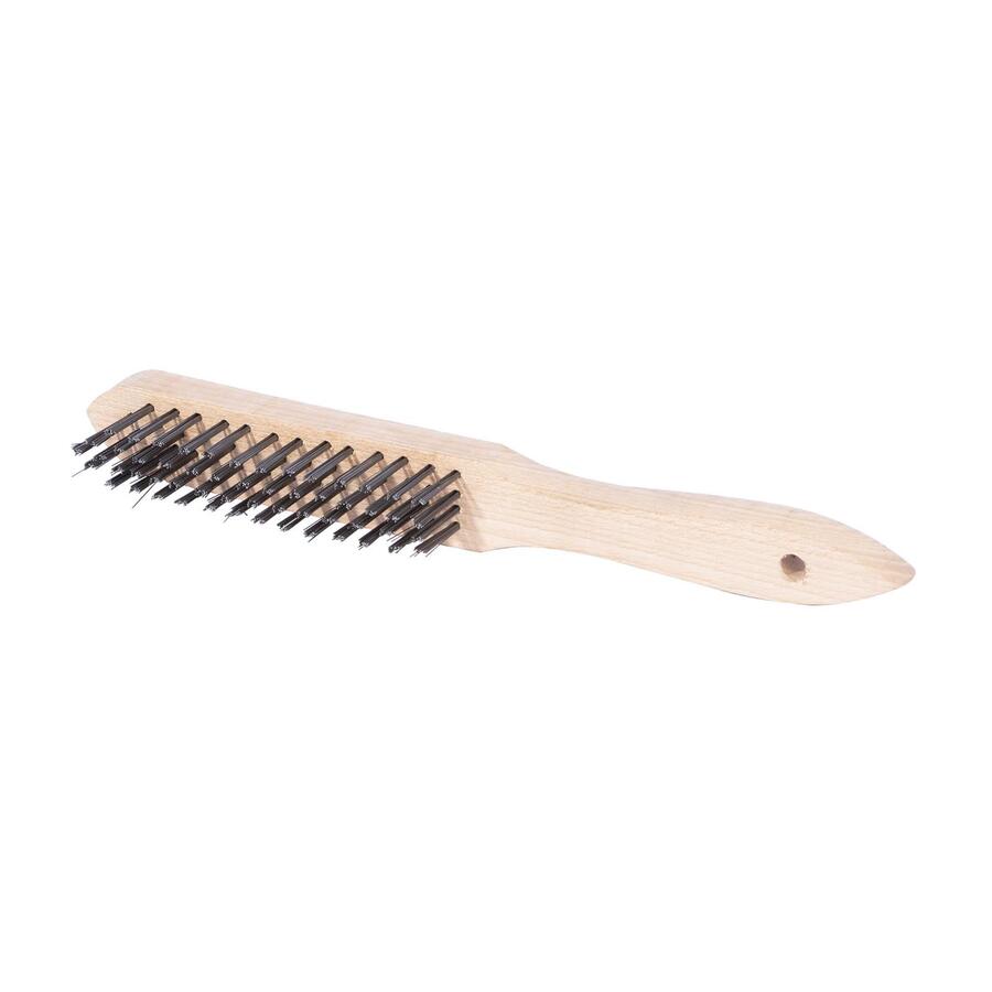 Kartáč je dobrý pro čištění nerezových a kovových materiálů. Ocelové dráty jsou uspořádány ve čtyřech řadách.