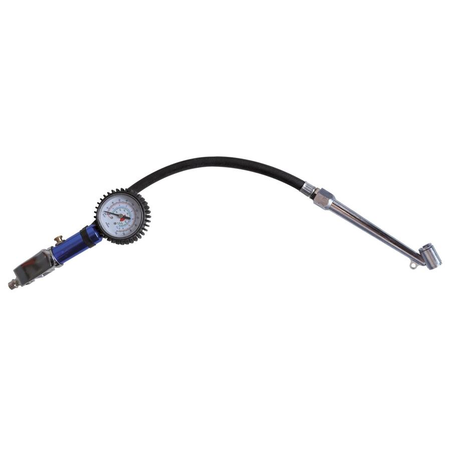 Pistole na huštění pneumatik s manometrem, odpouštěcím ventilem a připojením pro rychlospojku.