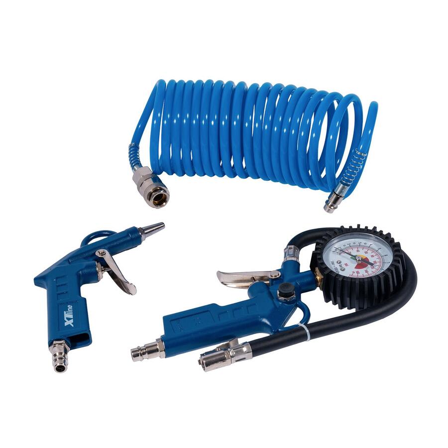 Základní sada pro kompresor k huštění pneumatik a čistění stlačeným vzduchem pomocí ofukovací pistole.