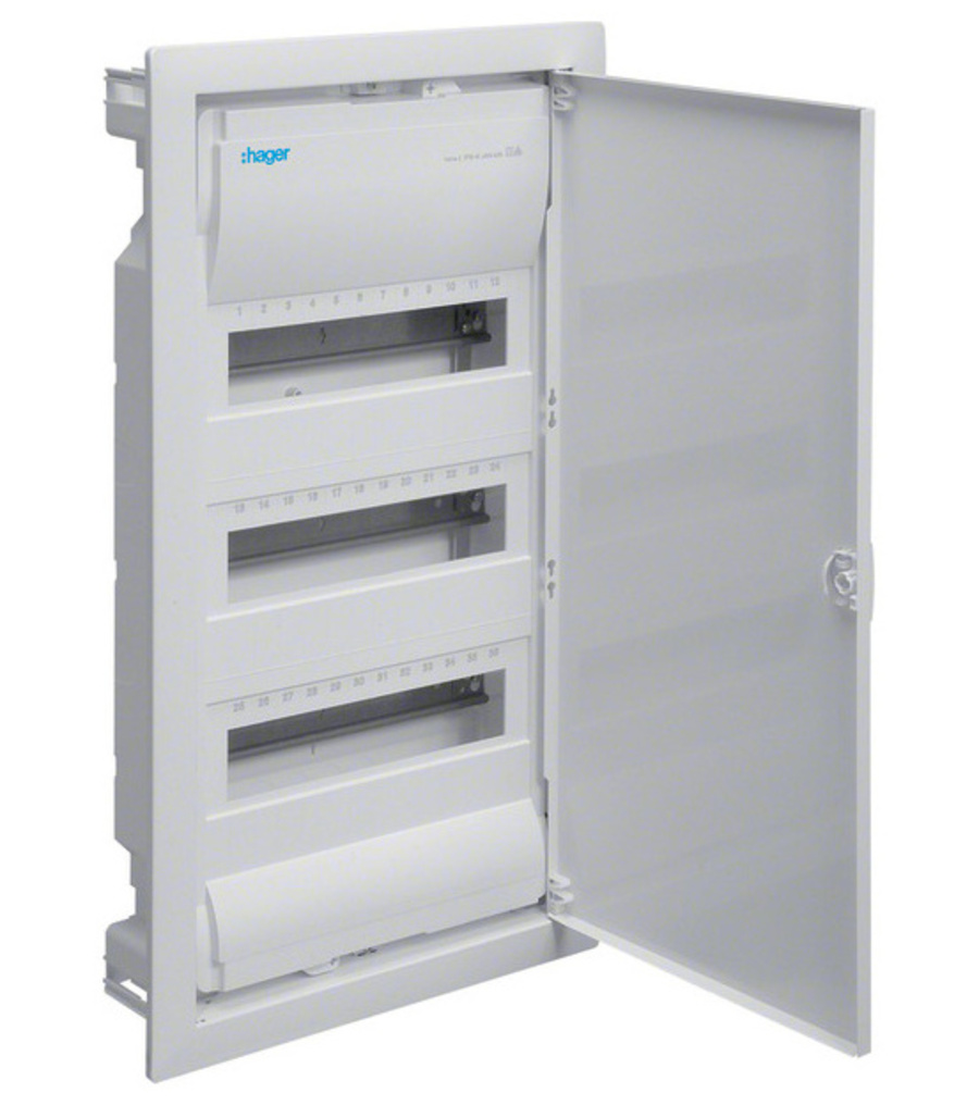 HAGER Skříň VOLTA VU36NC, 36TE, 3-řadá, zapuštěná, plastová vana, kovová plná dvířka, bezš
