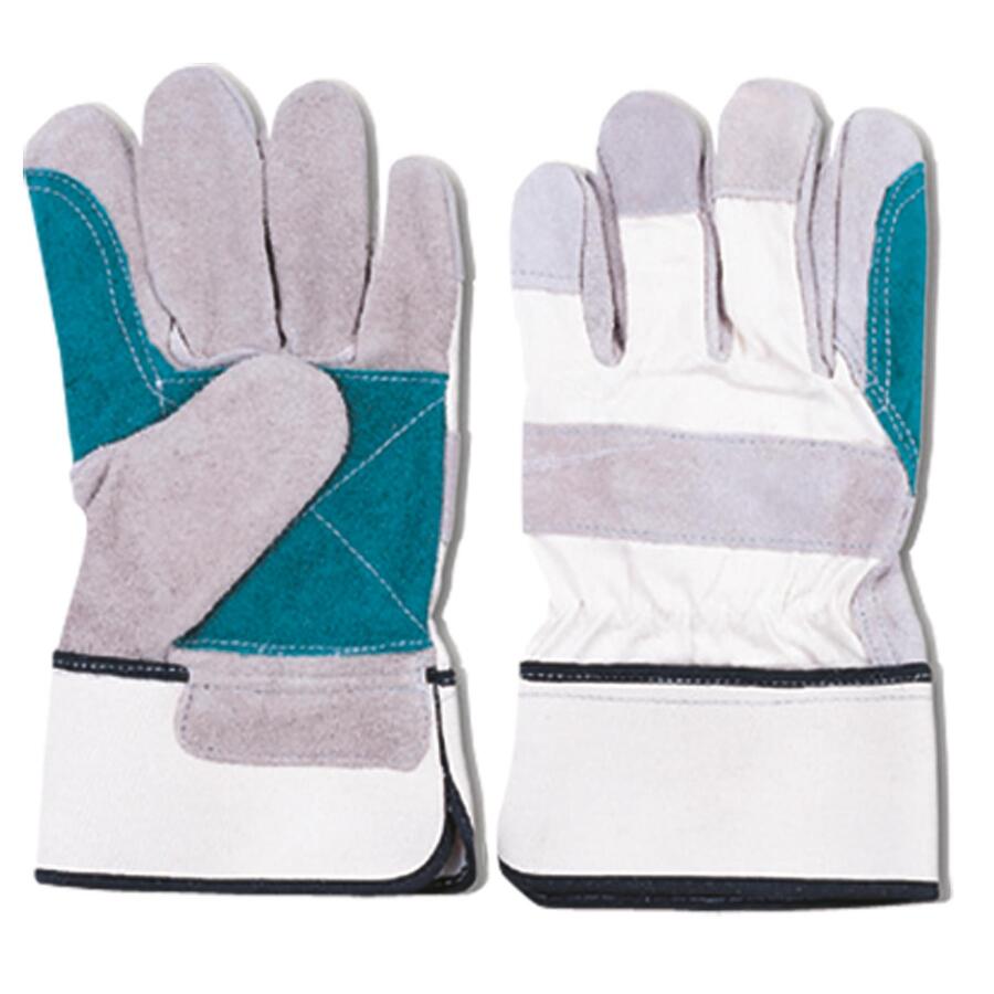 Zdvojená dlaň z šedé a zelené hovězí štípenky, hřbet a tuhá manžeta z bílé bavlněné tkaniny, podšívka ve dlani.