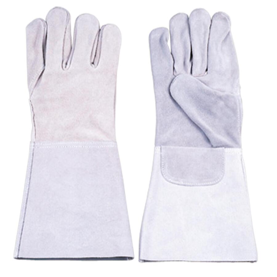 Celokožené rukavice z šedé hovězí štípenky, tuhá manžeta 15cm, bez podšívky – certifikát pro svářečské práce.