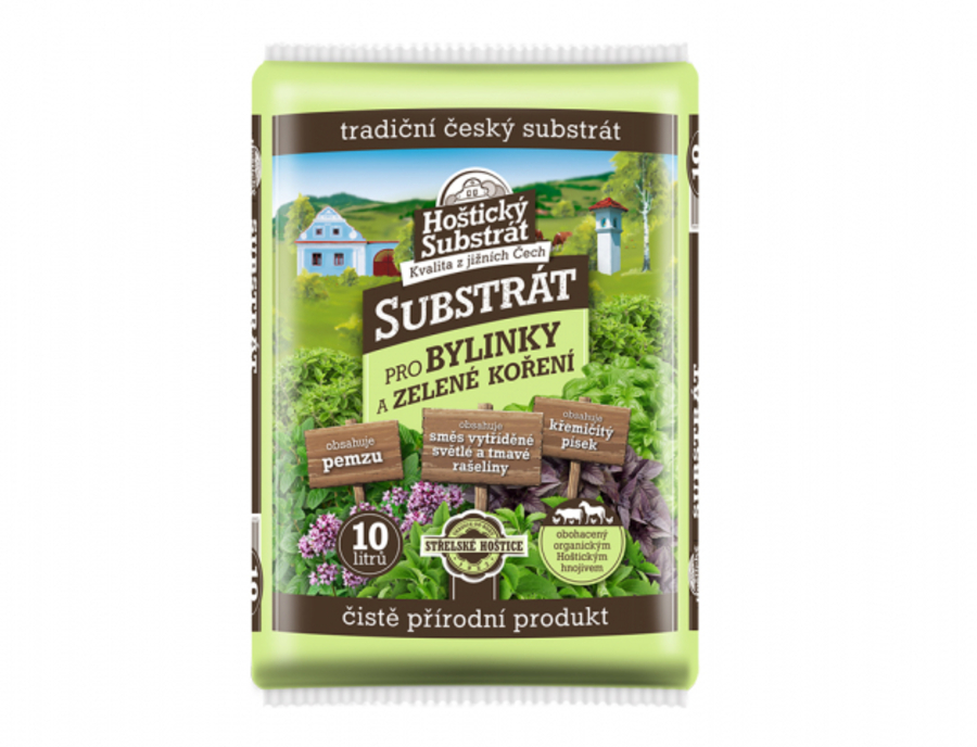 Substrát pro bylinky a zelené koření je vyroben ze směsi vytříděné světlé a tmavé rašeliny, pemzy, prosetého jemně tříděného křemičitého písku a organických hnojiv obsahujících všechny hlavní živiny i stopové prvky. Substrát neobsahuje minerální (průmyslová) hnojiva. Půdní reakce je upravena jemně mletým dolomitickým vápencem. Složení substrátu podporuje tvorbu silic a aromatických látek. Je ve formě mikrogranulátu, což zaručuje mnohem efektivnějšího rozmístění hnojiva v substrátu. Díky tomu je zajištěn rovnoměrný růst rostlin a tvorba kořenového systému. Přítomnost pemzy v substrátu má příznivý vliv na zadržování vody i na lepší provzdušnění substrátu. Obsahuje potřebné množství základních i stopových živin. Balení: 10 l.
