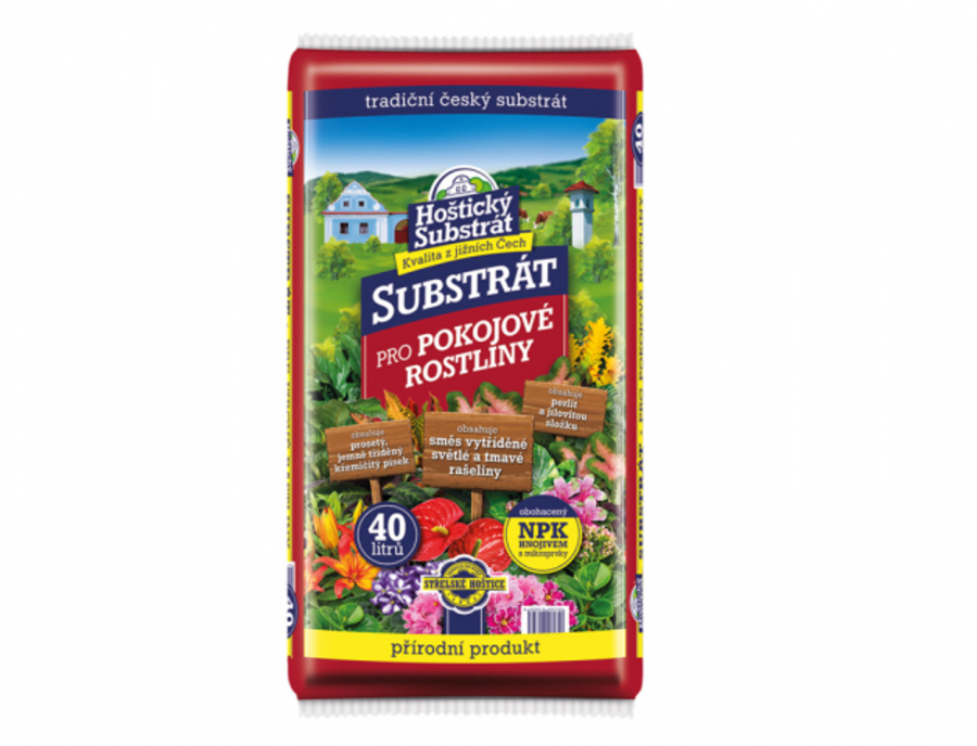 Hoštický substrát pro pokojové rostliny je vyroben ze směsi vytříděné světlé a tmavé rašeliny, prosetého jemně tříděného křemičitého písku, perlitu, přírodní jílovité složky a minerálního vícesložkového hnojiva s mikroprvky. Půdní reakce je upravena jemně mletým dolomitickým vápencem. Substrát je určen pro sázení a přesazování všech druhů pokojových rostlin. Má jemnou strukturu a díky perlitu i vysokou vzdušnost. Díky obsahu jílovité složky má vyšší poutavost vláhy i živin a zamezuje jejich vyplavování. Obsahuje potřebné množství základních i stopových živin na prvních cca 6 týdnů pěstování. Balení: 40 l.