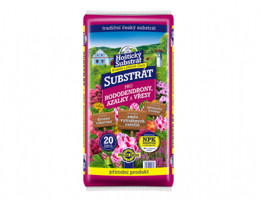 Hoštický substrát je určen pro rododendrony, azalky a vřesy. Je vyroben ze směsi vytříděné světlé a tmavé rašeliny s vhodnou kyselostí. K základnímu vyhnojení substrátu je použito minerální vícesložkového hnojivo s mikroprvky. Substrát je dále obohacen o fosforečné hnojivo a železo v chelátové formě. Svojí strukturou a optimálním poměrem jednotlivých typů rašelin je zajištěna rovnováha mezi vodní a vzdušnou kapacitou substrátu. Zvýšený obsah fosforu podporuje intenzitu kvetení i bohatost a velikost květu. Přídavek drcené rohoviny zajištuje dlouhodobé a pozvolné uvolňování dusíku i dalších živin, které jsou přítomny ve stopovém množství. Balení: 20 l.