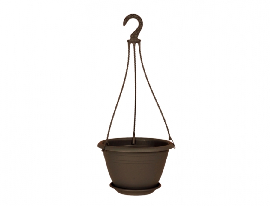 Plastový závěsný květináč kulatého tvaru s hladkým povrchem a jemným horizontálním členěním po obvodu. Součástí je pevný závěs se třemi lanky a hákem pro snadné zavěšení na balkon, terasu či pergolu. Konstrukce umožňuje stabilní osazení substrátem a je vhodná pro pěstování převislých květin i bylinek. Jednoduchý, nadčasový design se snadno začlení do různých typů exteriérů. Rozměry: průměr 30 cm. Barva: hnědá.
